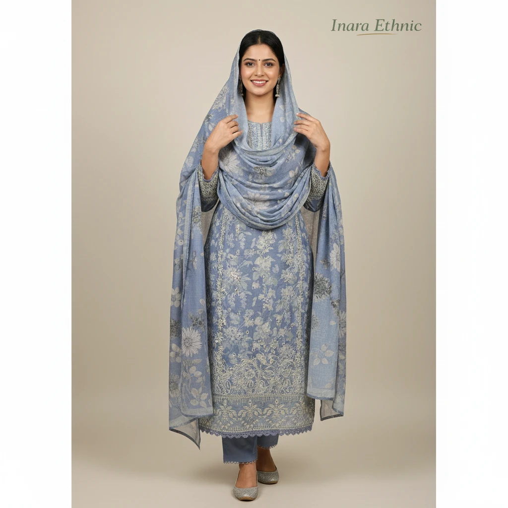Light Denim Blue Pakistani Cotton A-Line Kurta Set with Schiffli Embroidery (3-Piece)