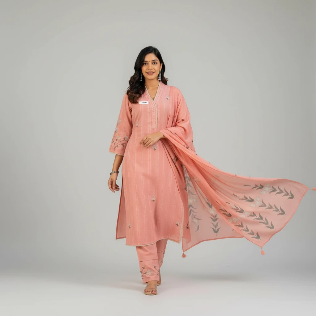 Blush Peach Handloom Cotton Kurta Set with Hand-Painted Floral Dupatta (3-Piece)
