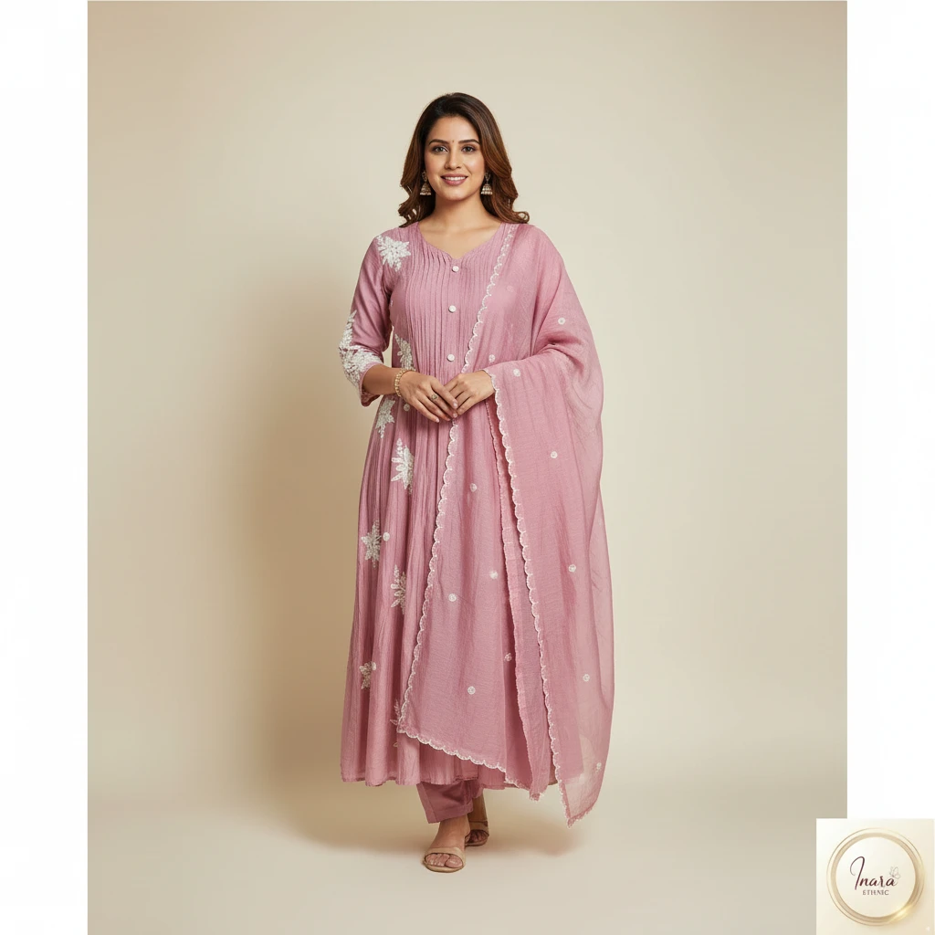Rose Blush Mulchanderi A-Line Kurta Set with Embroidered Dupatta (3-Piece)